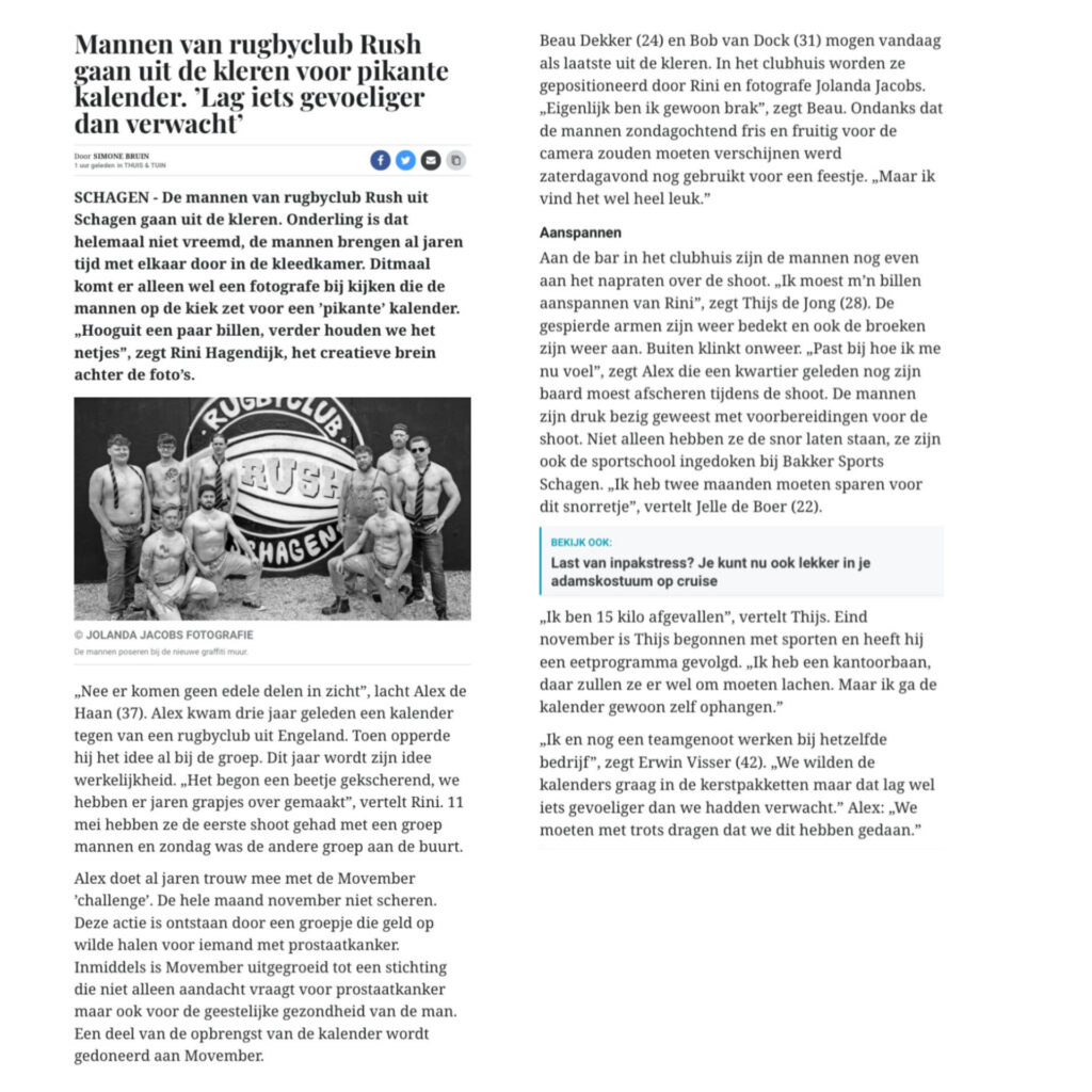 De mannen van Rush gaan landelijk! Pikante kalender trekt de aandacht! Mannen van rugbyclub Rush gaan uit de kleren voor pikante kalender ‘Lag iets gevoeliger dan verwacht’ Klik op de foto voor het originele artikel